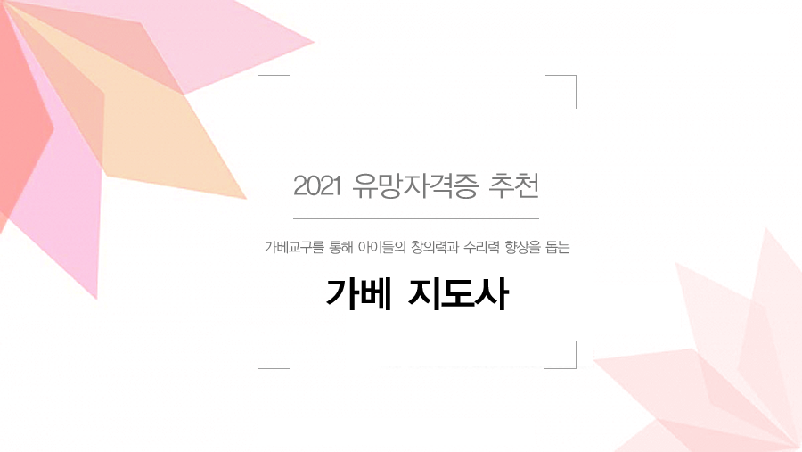 최근 방과 후 교육 확대에 발맞춰 가베 지도사는 누구나 배울 수 있고 전문가로 활동이 가능한 여성유망자격증으로 급부상하고 있습니다. 또한 가베는 창의적 인재 양성을 위한 제7차 교육과정 중 초등수학 분야에서 적극 권장되고 있습니다. 고용현장에서는 탄력적인 근무시간으로 지도활동이 가능하며 이른바 ‘엄마표 가베교육’으로도 활용할 수 있어 가베 지도사에 관심을 갖고 있는 분들이 꾸준히 증가하고 있습니다.